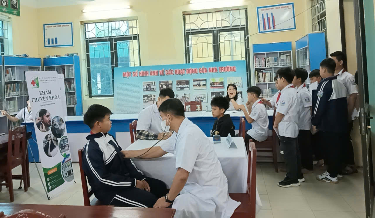Buổi khám được tiến hành với đầy đủ các chuyên khoa cần thiết. Ở chuyên khoa Nội tổng quát, học sinh được khám thể lực, đo huyết áp, kiểm tra tim, phổi và hệ tiêu hóa. Các bác sĩ nhẹ nhàng hướng dẫn từng động tác, vừa khám vừa trò chuyện, giúp các em hiểu rõ hơn về tình trạng sức khỏe của bản thân. Nhiều học sinh bày tỏ sự thích thú khi được biết chỉ số chiều cao, cân nặng và chỉ số BMI của mình – những con số nhỏ nhưng phản ánh quá trình lớn lên từng ngày.Tại chuyên khoa Mắt, các em được đo thị lực, kiểm tra tật khúc xạ và nhận lời khuyên bổ ích về việc giữ khoảng cách hợp lý khi đọc sách, học trực tuyến hoặc sử dụng thiết bị điện tử. Các bác sĩ còn hướng dẫn cụ thể cách bảo vệ đôi mắt – “cửa sổ tâm hồn” – bằng chế độ dinh dưỡng và thói quen sinh hoạt đúng cách. Khu vực Tai – Mũi – Họng diễn ra sôi nổi khi các bác sĩ kiểm tra thính lực, tai giữa, họng và mũi. Nhiều em ngạc nhiên khi được biết một số thói quen tưởng chừng vô hại như ngoáy tai, hít nước mũi mạnh hay ăn uống đồ quá lạnh lại có thể gây ảnh hưởng tới sức khỏe tai – mũi – họng. Qua đó, các em được hướng dẫn cách giữ gìn vệ sinh và phòng ngừa các bệnh viêm nhiễm thường gặp. Ở chuyên khoa Răng – Hàm – Mặt, không khí trở nên vui tươi hơn khi các bác sĩ khám răng miệng và hướng dẫn các em thực hành chải răng đúng cách. Những lời khuyên nhỏ về việc đánh răng sau bữa ăn, hạn chế đồ ngọt hay đi khám răng định kỳ đã giúp học sinh hiểu rằng, một nụ cười đẹp bắt đầu từ thói quen chăm sóc răng miệng hằng ngày. Cuối cùng, chuyên khoa Da liễu nhận được sự quan tâm đặc biệt của các em, nhất là ở lứa tuổi dậy thì. Các bác sĩ kiểm tra tình trạng da, tư vấn cách chăm sóc, giữ vệ sinh cá nhân đúng cách và hướng dẫn phòng tránh các bệnh ngoài da thường gặp. Nhiều em chia sẻ rằng đây là lần đầu tiên các em được nghe giải thích cụ thể về những thay đổi của làn da ở tuổi lớn, giúp các em thêm tự tin và biết yêu thương bản thân hơn.